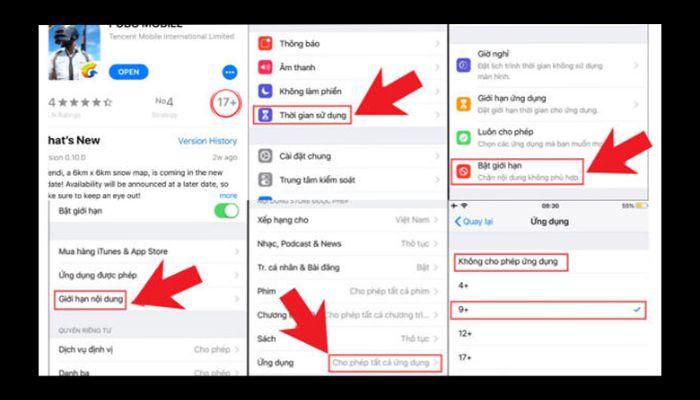 Bước 3: Lần lượt chọn các mục: Bật giới hạn, Giới hạn nội dung, Ứng dụng.