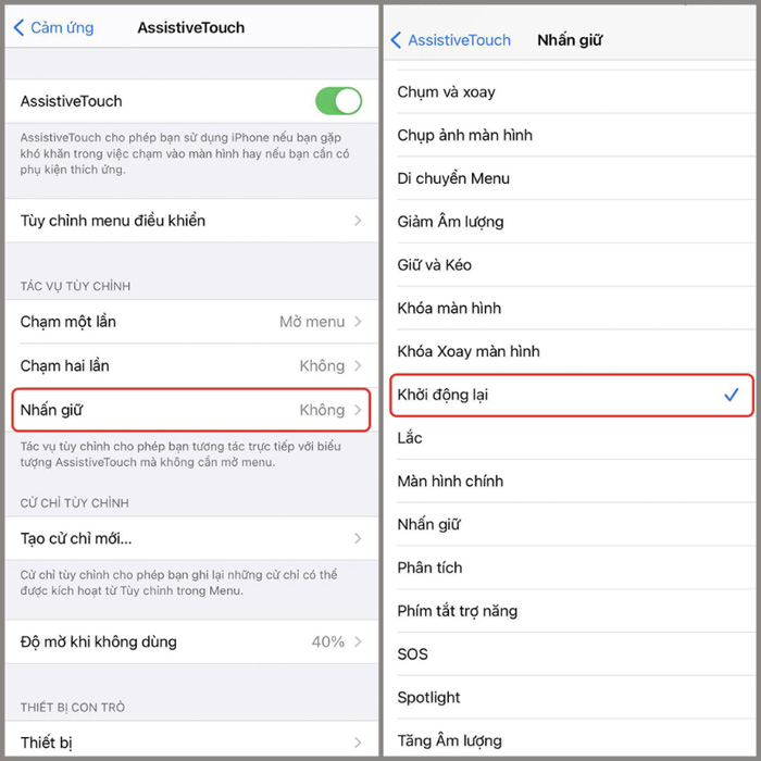 Bước 3: Tiếp tục, chúng ta quay lại giao diện AssistiveTouch và chọn Nhấn giữ rồi chọn tác vụ muốn sử dụng. Với thao tác này, bạn chỉ cần nhấn giữ nút home ảo là máy có thể tự động khởi động lại.
